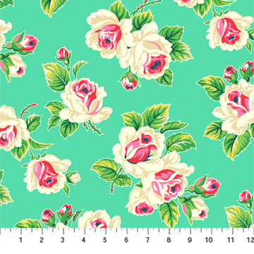 This beautiful print of tossed rose buds on an aqua background was designed by Heather Bailey for Figo fabrics as one of the coordinating prints of True Kisses. Brought to you by Northcott/Figo Fabrics.
