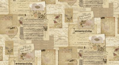 This beautiful collage print shows romantic music sheets, butterflies, and hearts. Piano Forte is brought by Stof Fabrics. Colors are a gold/taupe.