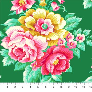 Sold out. This beautiful green backdrop boasts BIG bouquets of roses in teals, greens and golds! Designed by Heather Bailey for Figo fabrics, this collection is sure to fly out the door quickly!