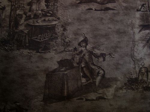 Moda features Vienna Nights Opera toile tone on tone in elegant chocolate tones in this excellent quality cotton fabric. This makes a beautiful quilt back or softly flowing lightweight drapes for that special music studio for inspiration. Compliments the Print Concepts musical instruments fabric. For larger view, click on either picture! The color of this fabric is a rich dark chocolate!