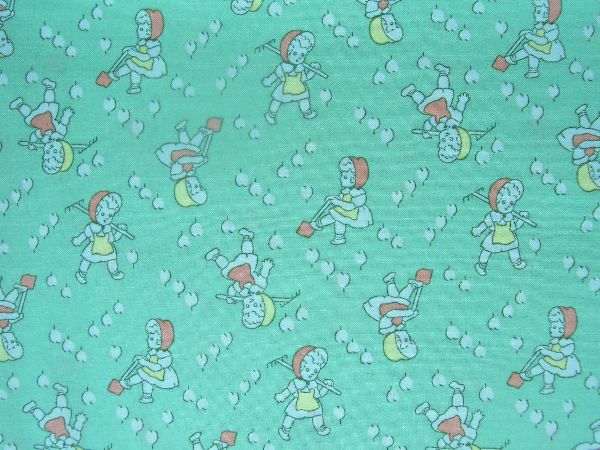 South Seas brings this cheerful feedsack print in a pale mint green background little girls at workday.