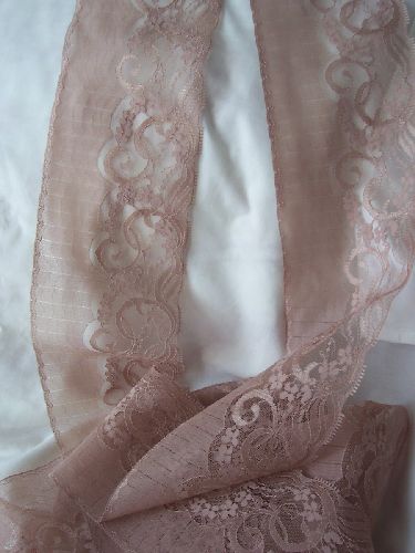 This exquisite lace in vintage flesh color comes 4.5 inches wide woven in a border design with finished scalloped edges on both sides.