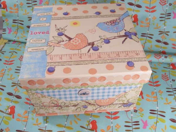 Temporarily out of stock. These delightful fabrics come from the Wrens Friends collection designed by Gina Martin for Moda Fabrics. This complete quilt kit includes the backing shown in the background, all fabrics for the top, includes the Rick Rack and even the Buttons for the Birds eyes! This kit uses the pattern Free as a Bird by Abbey Lane Quilts and measures 60 inches X 75 inches when finished. This kit comes shipped in this beautiful keepsake box to keep all the blocks in while making the quilt and is a perfect keepsake box for special memories when the quilt is complete!